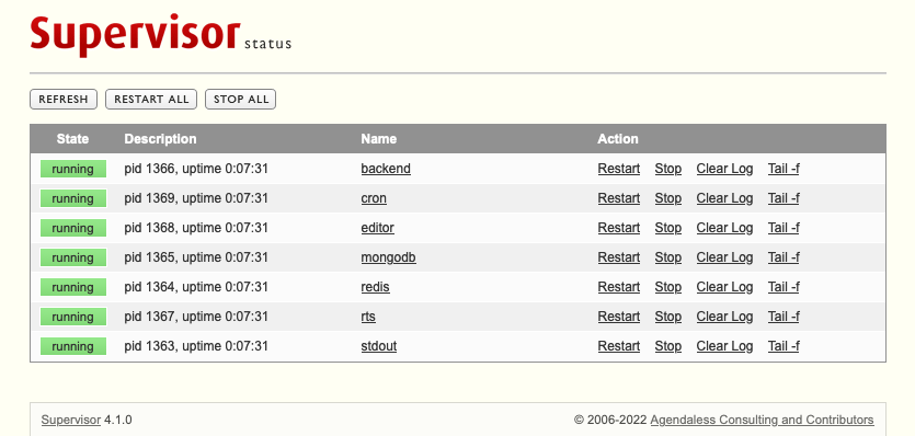 Appsmith has a dedicated web interface for monitoring Appsmith processes, called Supervisor.