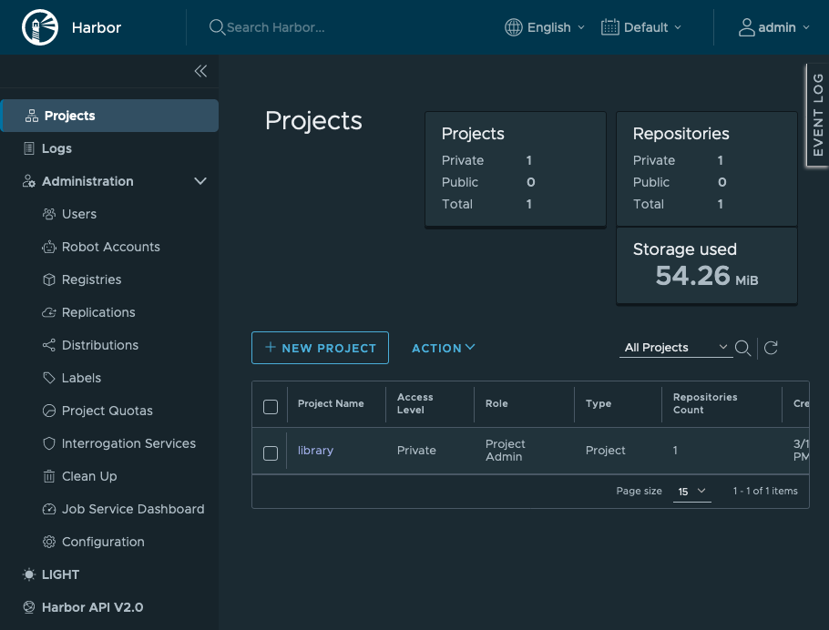 You can go to the Harbor dashboard in your browser to see the results. Navigate to the Projects page using the menu on the left, and select the library project from the listing. You should see your image listed.