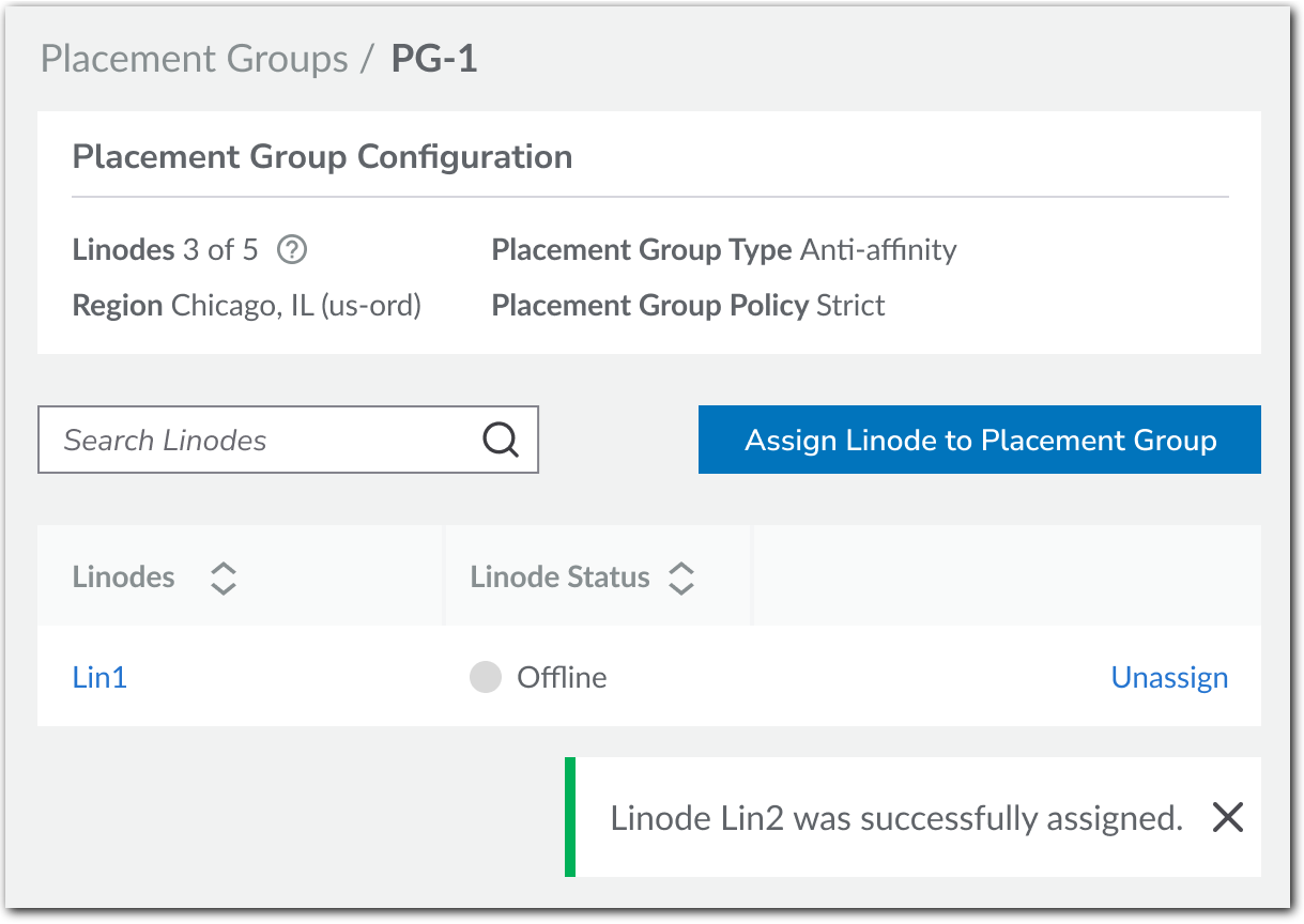 Click Assign Linode to Placement Group. The Assign Linodes form opens.